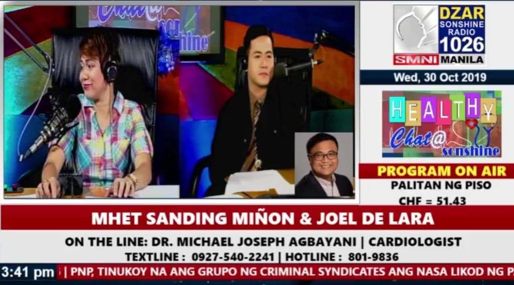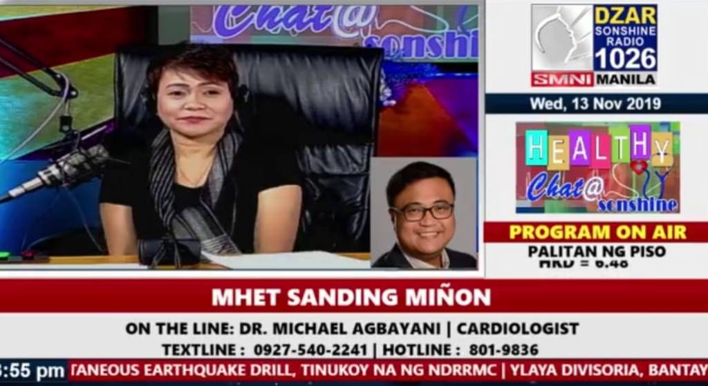 The show, entitled Healthy Chat @ Sonshine, is hosted by Mhet Miñon and Joel De Lara. The topic on October 30, 2019 was heart failure.