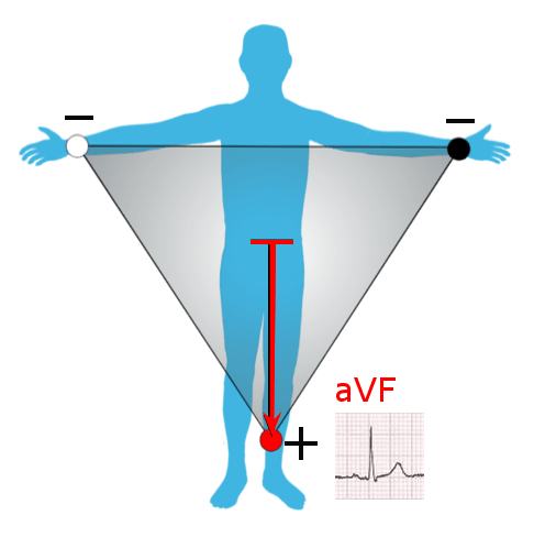 aVF is an augmented lead and is thus a unipolar lead. It is derived by making the left arm and right arm electrodes the negative pole and the foot electrode as the positive pole. Being unipolar, aVF has a different “strength” than leads I, II, and III (bipolar leads). See FIGURE 3.