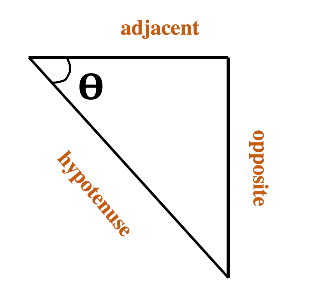 In determining the two other angles of a right triangle (remember those?), we use the ratios of the different sides. Given an angle theta θ, the ratio of the opposite side and the hypotenuse is the sine. The ratio of the adjacent side and hypotenuse is the cosine. And the ratio of the opposite side and adjacent side is the tangent. To get the angle θ from known ratios, you use the inverse functions of these — either the arc sine, arc cosine, or the arc tangent (depending on which measurements you have of course). See FIGURE 1.