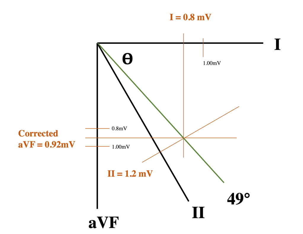 Let’s say we have an ECG with the following measurements for a particular ECG: Lead II is 1.2mV, lead I is 0.8 mV, and lead aVF is 0.8 mV.